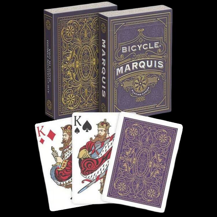 Карти за игра – Marquis – Bicycle playing cards се отличават с луксозен, отличителен дизайн, който напомня за епохата на арт деко от 30-те години на миналия век. Картите за игра са отпечатани на висококачествена хартия. Дизайнът на кутията и гърба на картите е базиран на колодата Cruiser #96 на Андрю Дъгърти, която е отпечатана за първи път в началото на 1900 г. Картите за игра Bicycle Marquis са истинско произведение на изкуството.