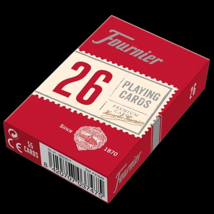 Карти за игра – 26 Bridge Red – Fournier playing cards са с размер за бридж и с ленено покритие. Техните карти за игра, свързани с покер, са най-разпространените в международен план от колодите на Fournier. Благодарение на своето качество и защитни елементи, тези карти присъстват в най-добрите игрални зали и казина на всички 5 континента. Без съмнение Fournier е най-търсената марка от играчите на покер по целия свят.