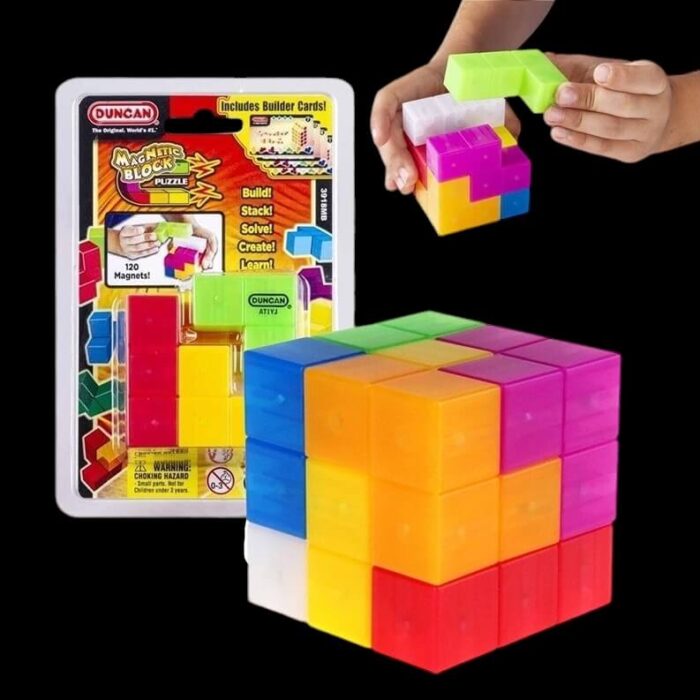 📖 Duncan’s “must-have” brain game, the MagNetic Block™ includes 7 different magnetic colored “block bundles” that can stack together to create different shapes, or solve for a perfect cube.