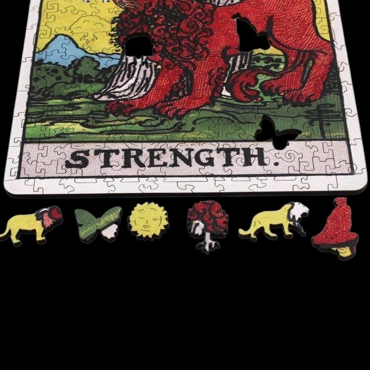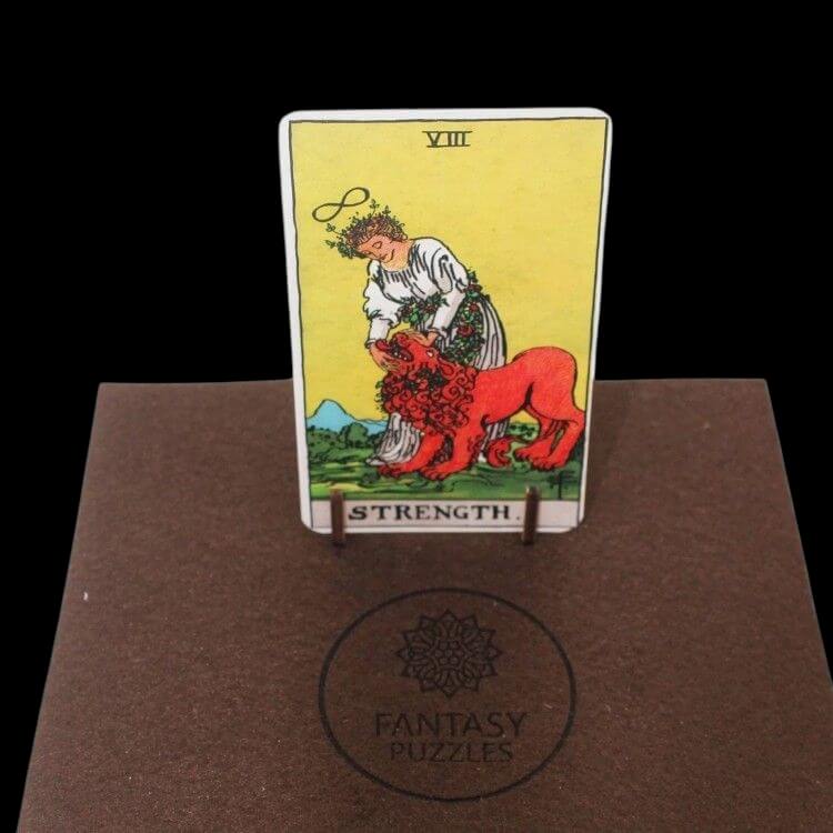 Дървен пъзел – Rider Waite Tarot Strength – Fantasy Puzzles wooden puzzle e от колекцията „Таро карти“. Fantasy Puzzles създадоха тази колекция за феновете на Таро картите, за да могат да изпитат нови преживявания, докато разгадават картинката на любимата си Таро карта.