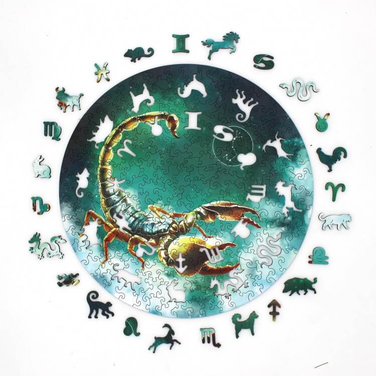 Fantasy Puzzles са дървени пъзели с очарователни цветове и форми. Всеки пъзел съдържа много цветни фигури на животни, с които да си играете. Всяка част от пъзела е уникална по своята форма. Пъзелите са форма на развлекателна дейност, която ще ви помогне да избягате от ежедневните грижи. Дървен пъзел – Zodiac: Scorpio – Fantasy Puzzles wooden puzzle е от серия пъзели, базирани на астрологията. Всеки пъзел изобразява разположението на звездите от съответния знак на небето.