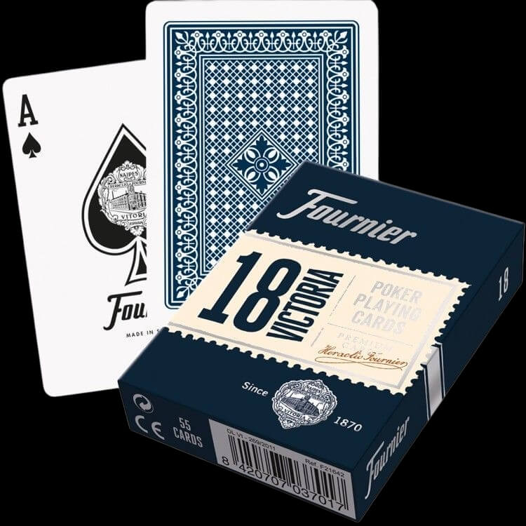 Карти за игра – 18 Victoria Blue – Fournier playing cards с ленено покритие. Техните карти за игра, свързани с покер, са най-разпространените в международен план от колодите на Fournier. Благодарение на своето качество и защитни елементи, тези карти присъстват в най-добрите игрални зали и казина на всички 5 континента. Без съмнение Fournier е най-търсената марка от играчите на покер по целия свят.