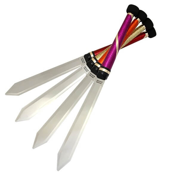 Ножове за жонглиране – Glitter Airsword – Freaks juggling knife са изключително бързи и визуално зашеметяващи. Тези красиво завършени ножове са впечатляващ реквизит за изпълнение, с който се жонглира точно като със стандартна бухалка. Ножовете „AirSword“ имат симетричен дизайн, който позволява странични завъртания и подобрява цялостния баланс на реквизита. Теглото също не е много далеч от това на традиционните бухалки, което прави смяната от бухалки малко по-лесна.