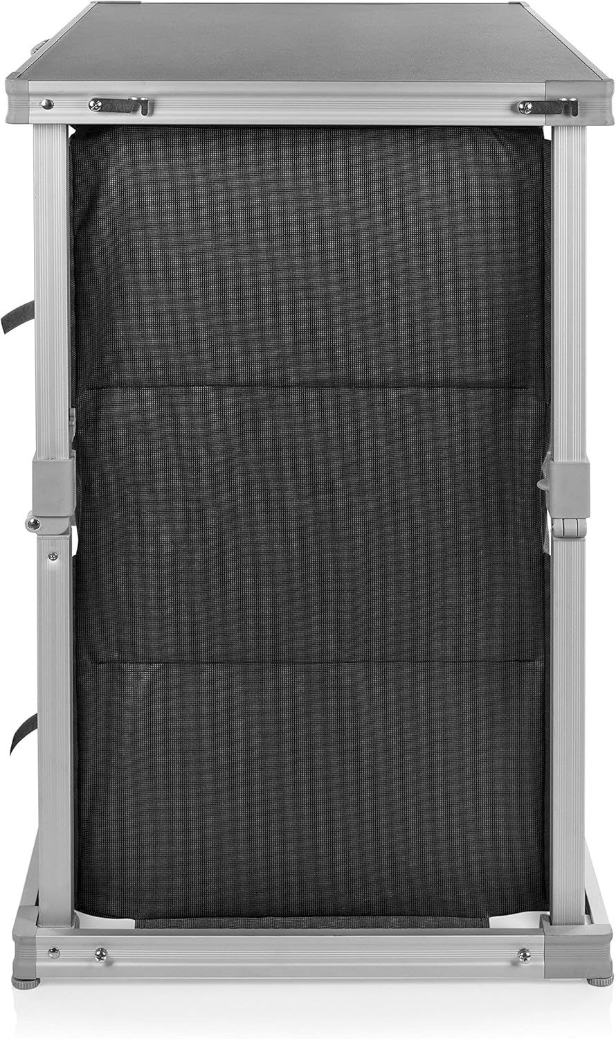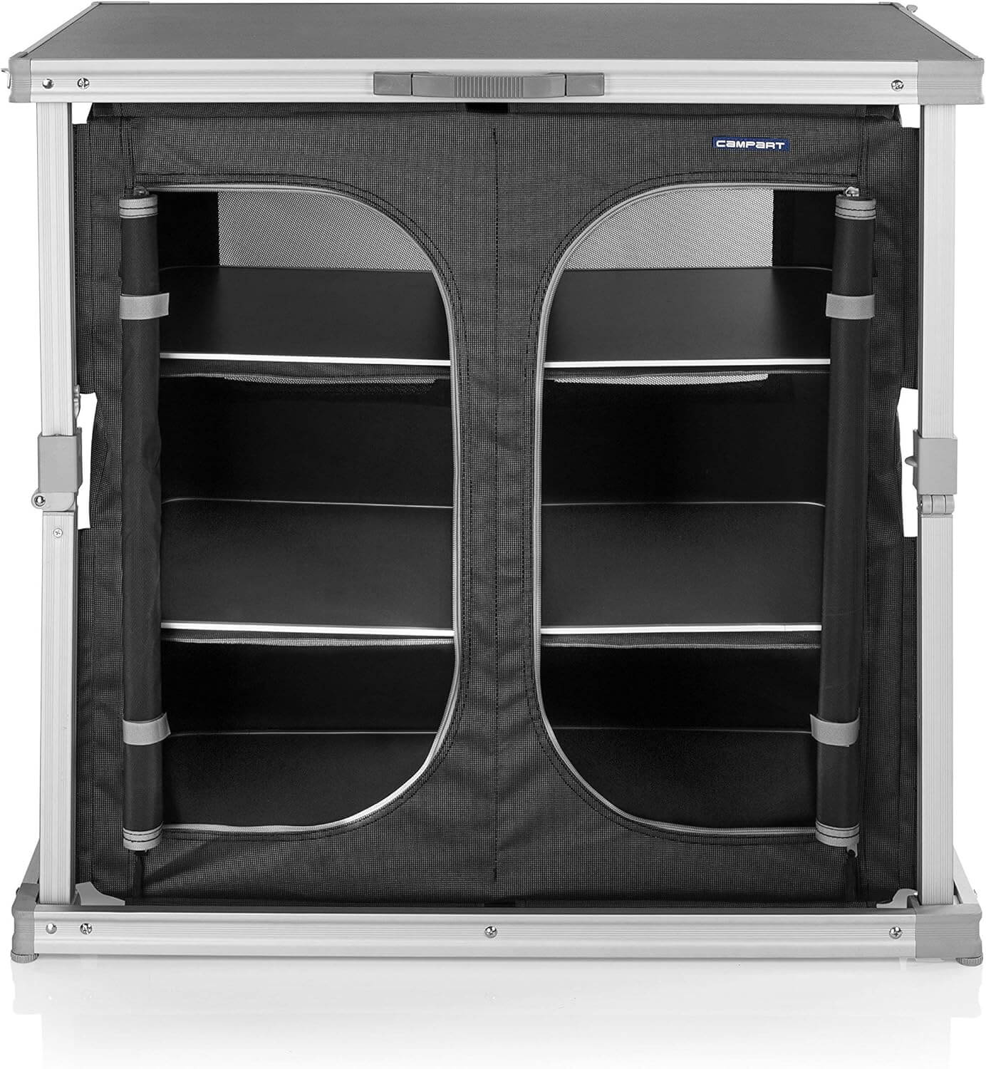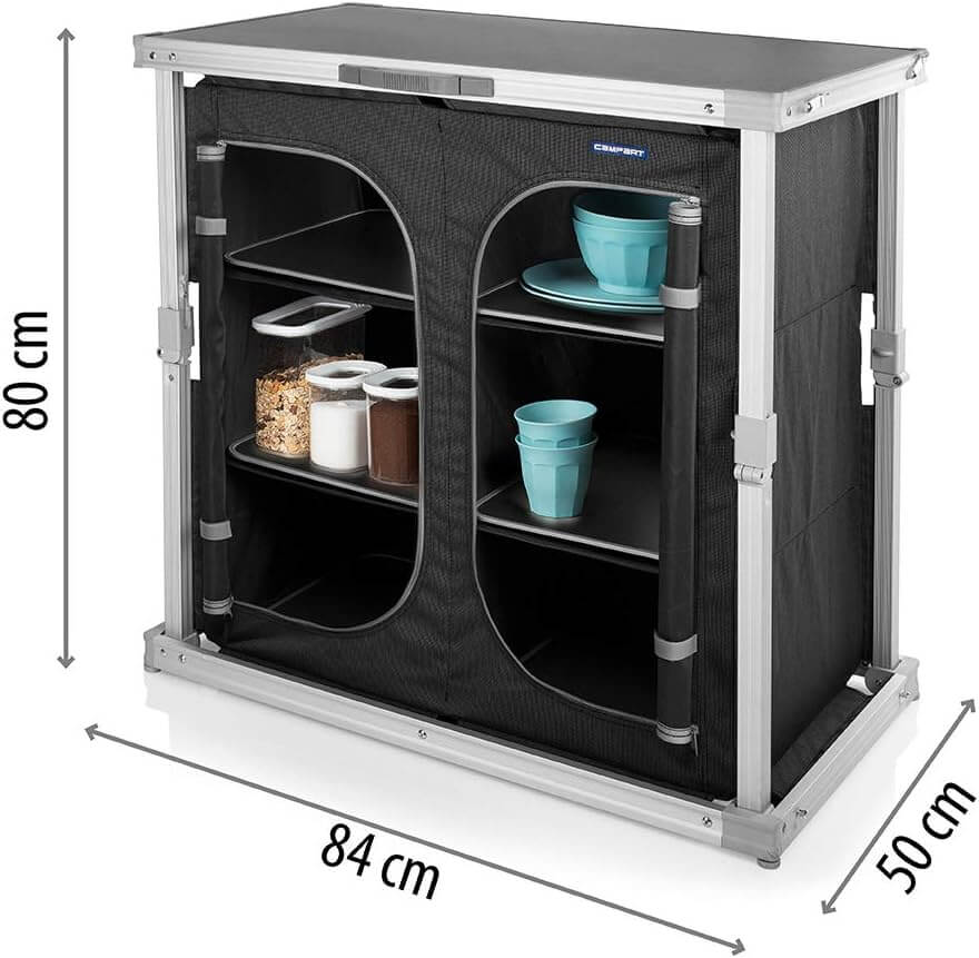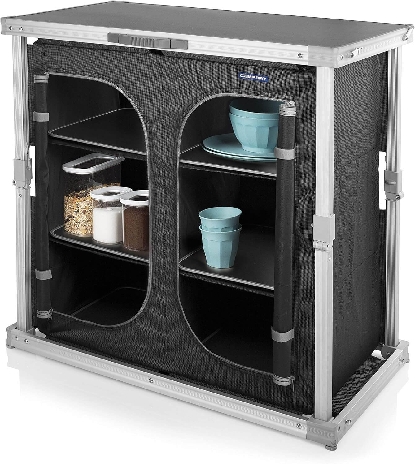 Сгъваем къмпинг шкаф кухня Campart – Преносим шкаф с рафтове, алуминиева конструкция, идеален за къмпинг, каравана и палатка. Ако търсите практично и удобно решение за организация на багажа по време на къмпинг, този шкаф кухня е идеалният избор. Създаден специално за любителите на outdoor приключенията. Шкафа кухня комбинира функционалност, стабилност и лесно пренасяне в едно компактно решение.
