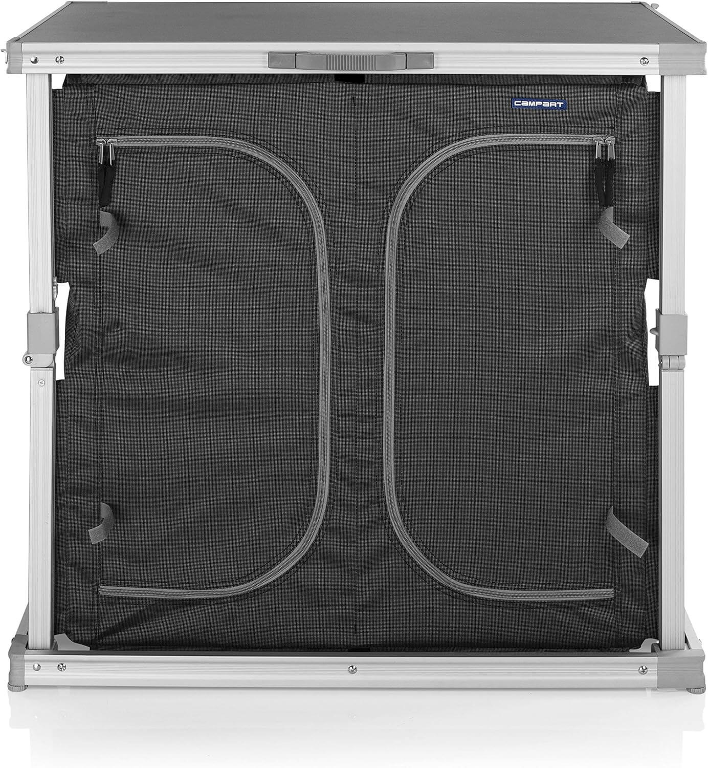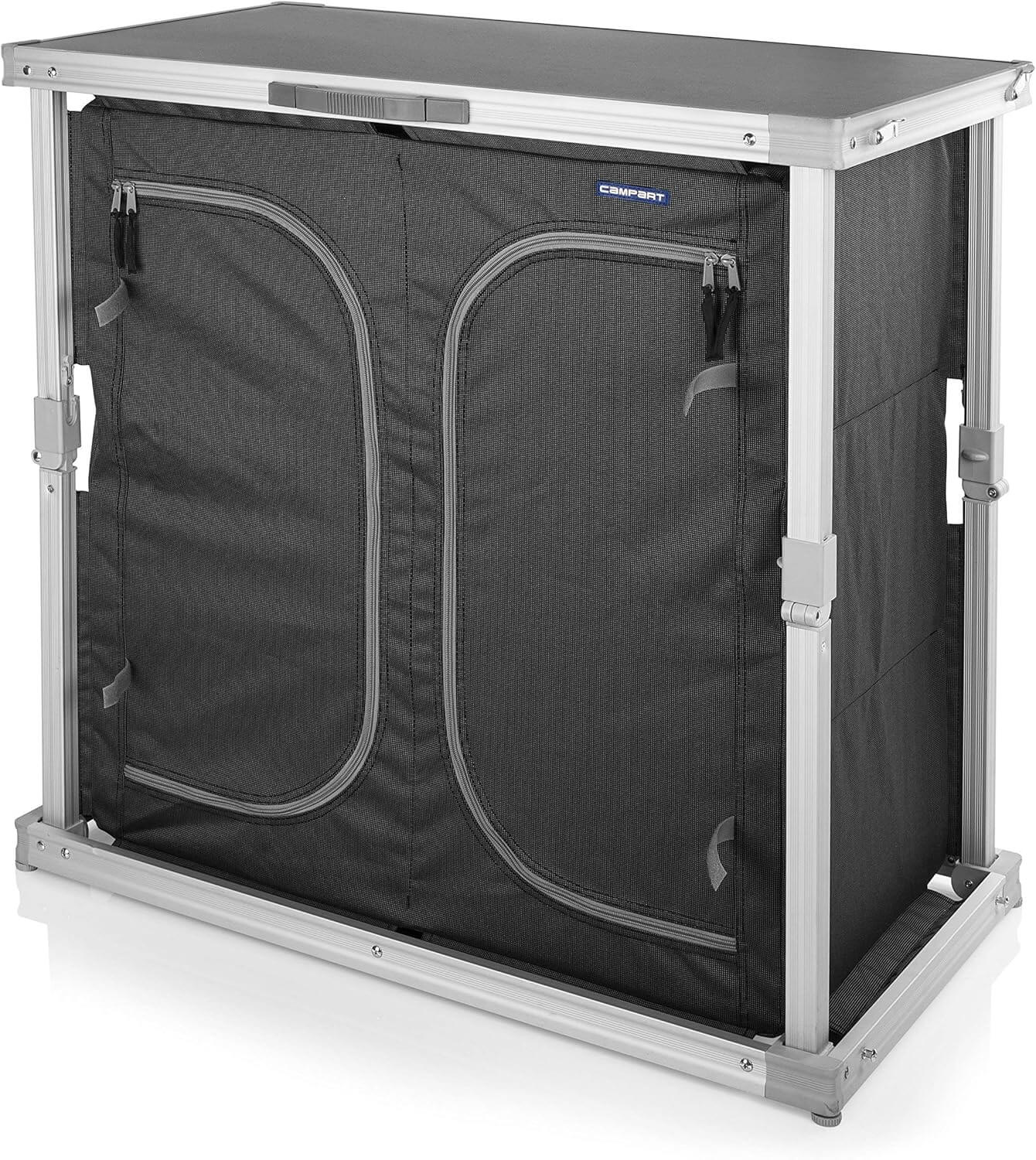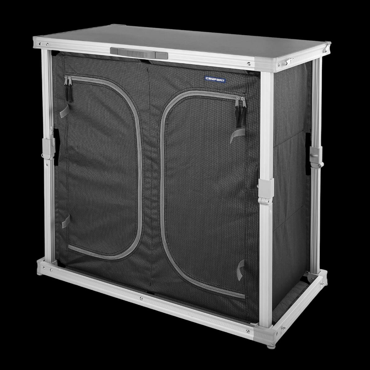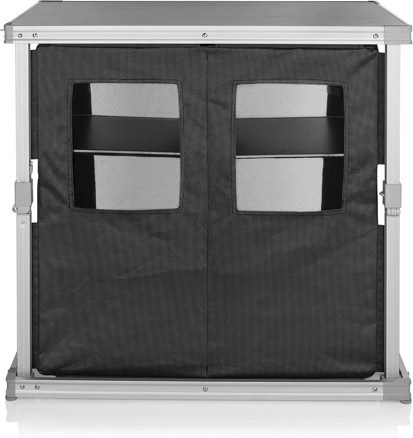 Сгъваем къмпинг шкаф кухня Campart – Преносим шкаф с рафтове, алуминиева конструкция, идеален за къмпинг, каравана и палатка. Ако търсите практично и удобно решение за организация на багажа по време на къмпинг, този шкаф кухня е идеалният избор. Създаден специално за любителите на outdoor приключенията. Шкафа кухня комбинира функционалност, стабилност и лесно пренасяне в едно компактно решение.