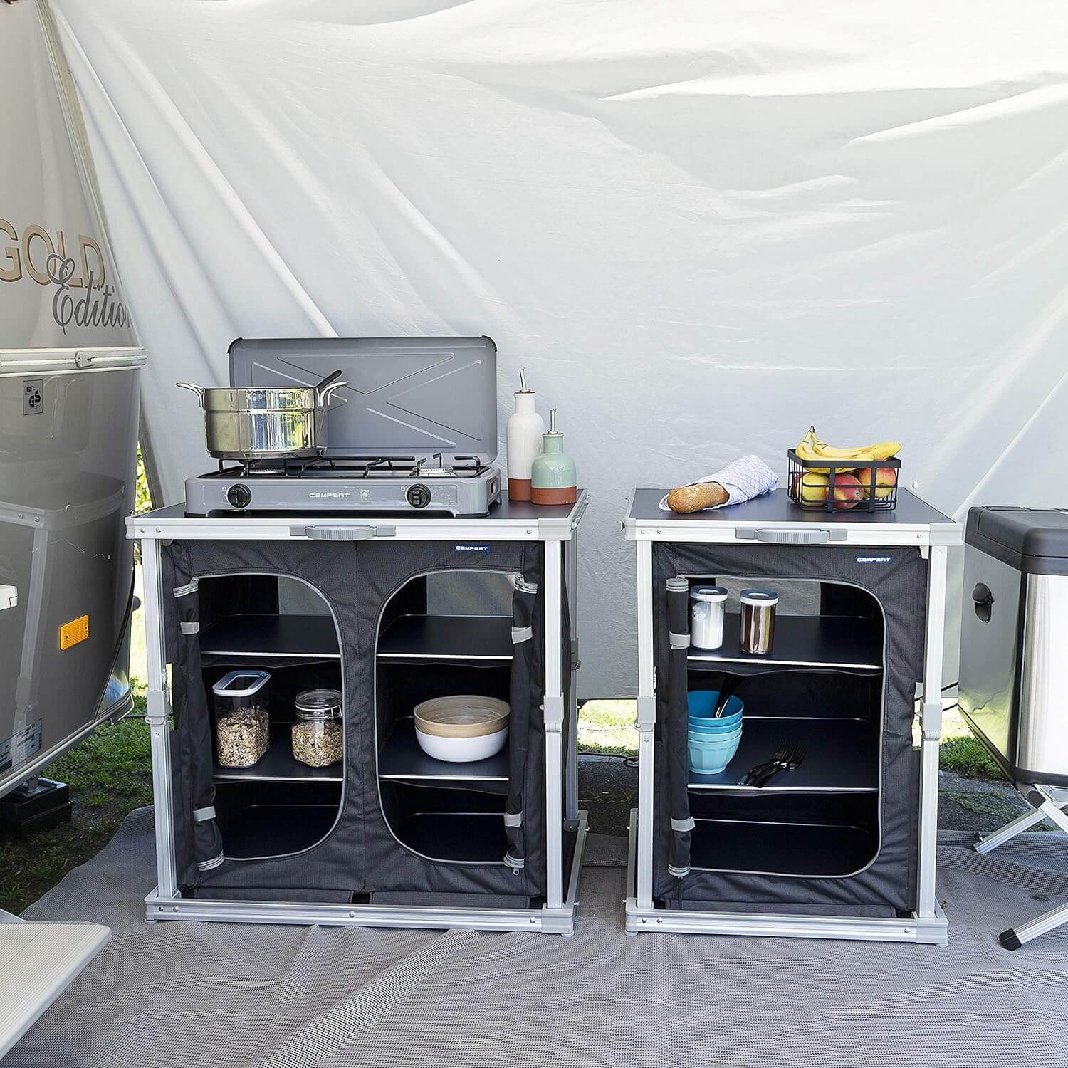 📖 Представяме Ви Сгъваем къмпинг шкаф кухня Campart – Преносим шкаф с рафтове, алуминиева конструкция, идеален за къмпинг, каравана и палатка.