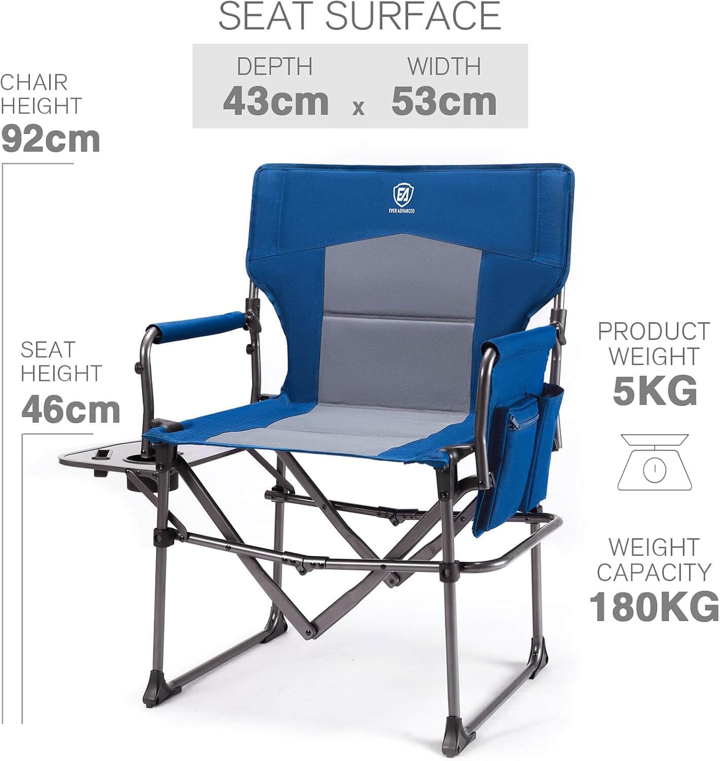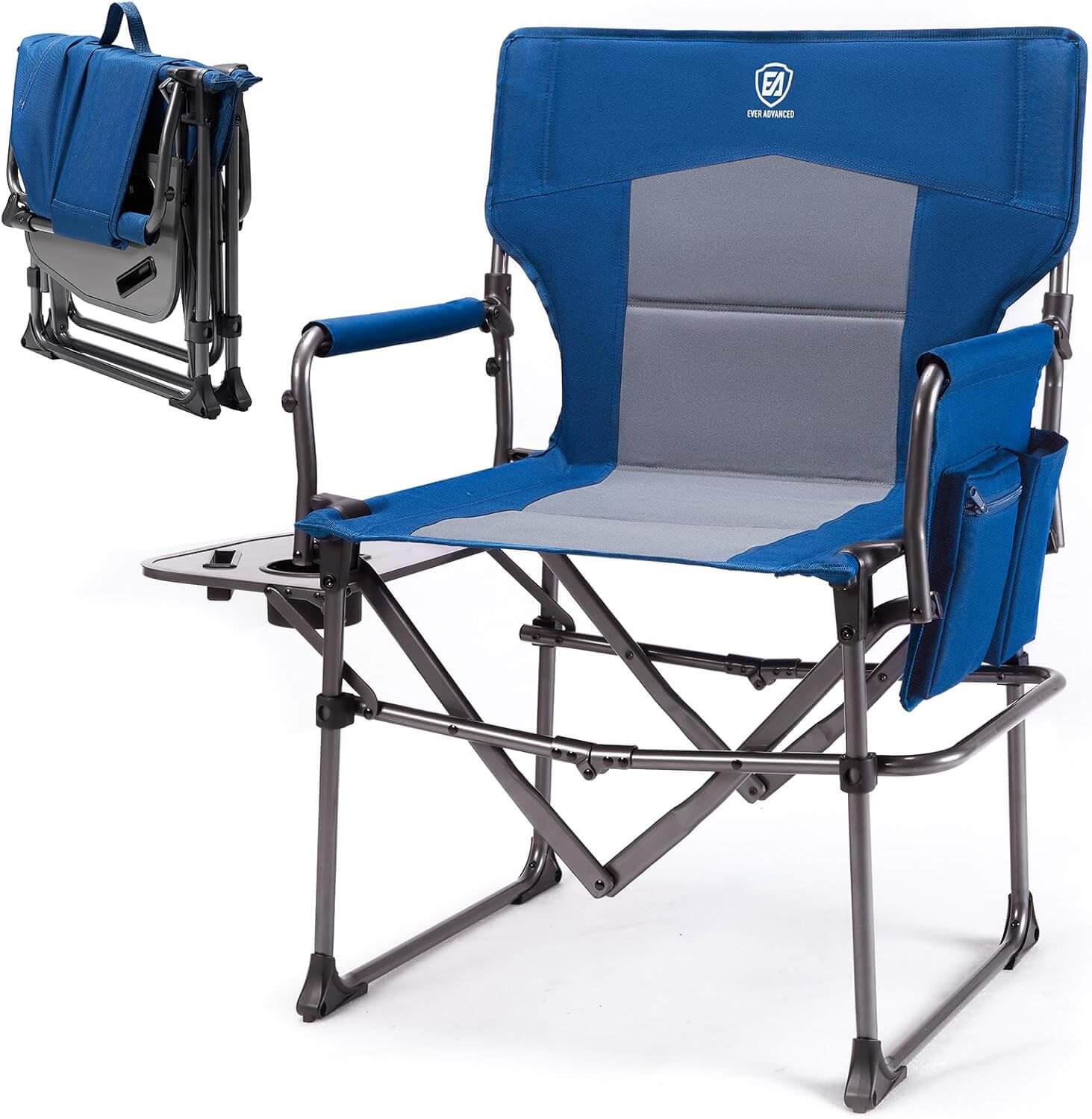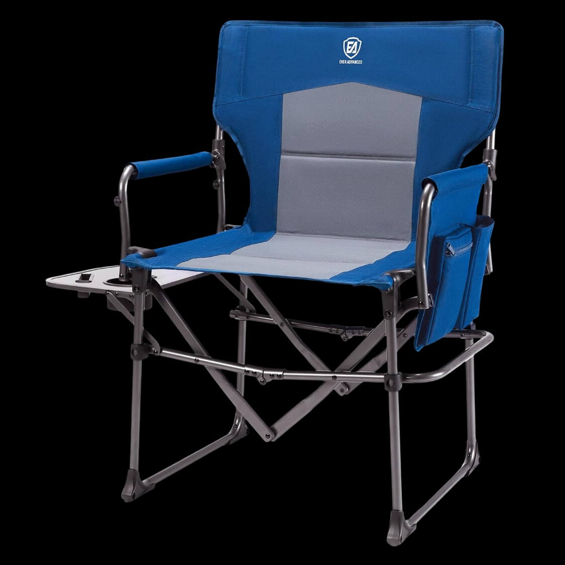 Сгъваем къмпинг стол с масичка Ever Advanced – до 180 кг, с поставка и джоб, удобен за къмпинг, риболов и пикник. Къмпинг стол с масичка, който комбинира комфорт, здравина и практичност. Този модел е отлично решение за всякакви outdoor активности. Създаден с мисъл за удобството на потребителя, стола предлага стабилна конструкция и функционален дизайн, който го отличава от стандартните къмпинг столове.