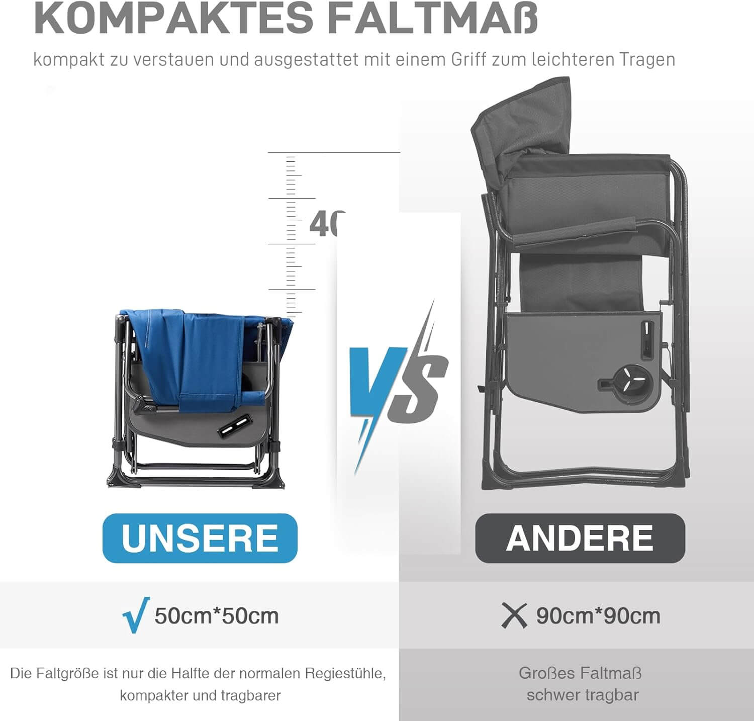 Сгъваемият дизайн позволява бързо и лесно прибиране без необходимост от монтаж. Столът се сгъва до компактни размери и разполага с удобна дръжка за пренасяне. Това го прави идеален преносим стол за къмпинг и пътуване.