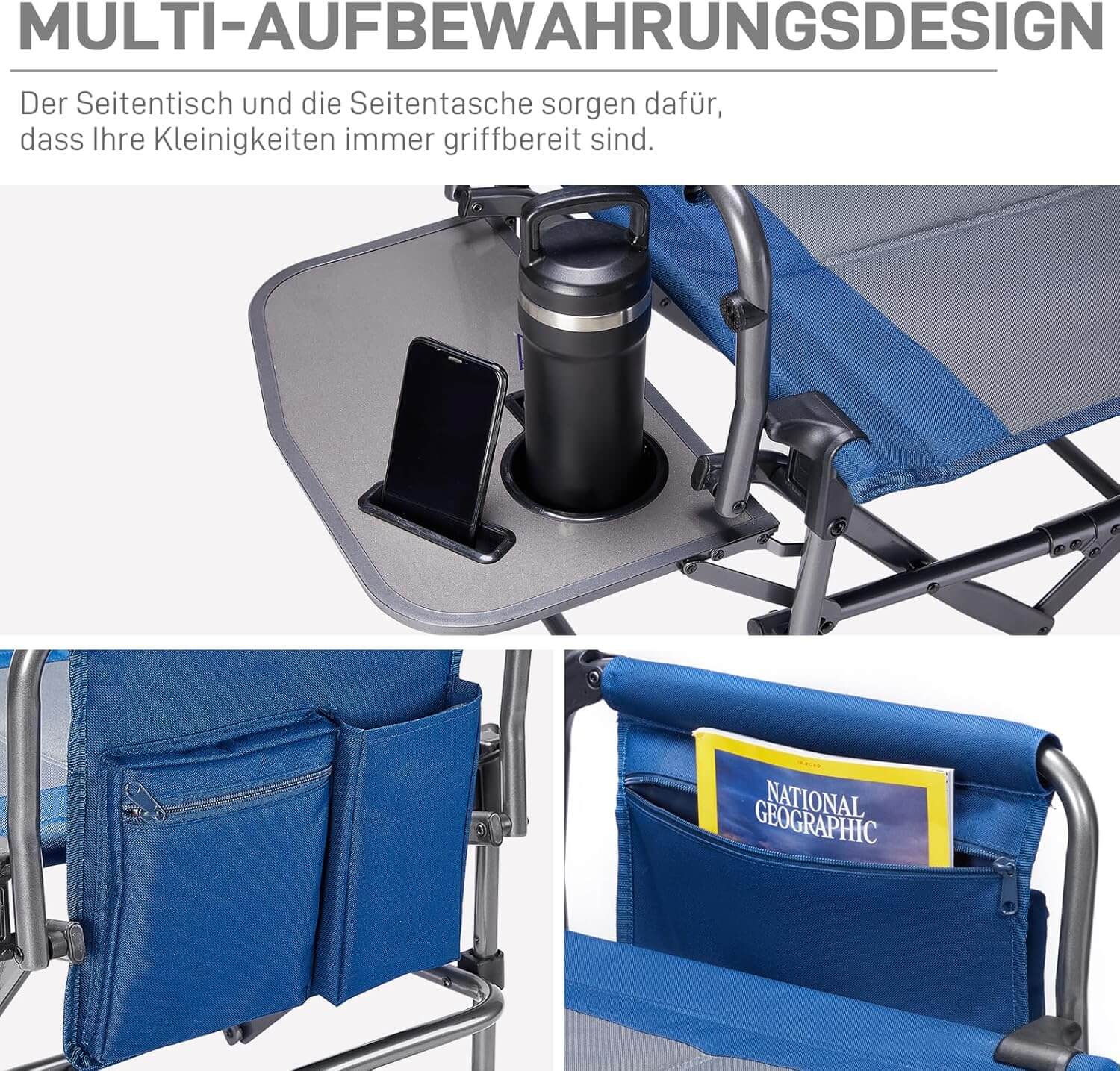 Този къмпинг стол се отличава със своята функционалност. Вградената странична масичка е идеална за поставяне на напитки, храна или аксесоари. Допълнителният джоб осигурява удобно място за съхранение на телефон, книга или други лични вещи. Изключително практичен избор за къмпинг, риболов, пикник или дори градината.