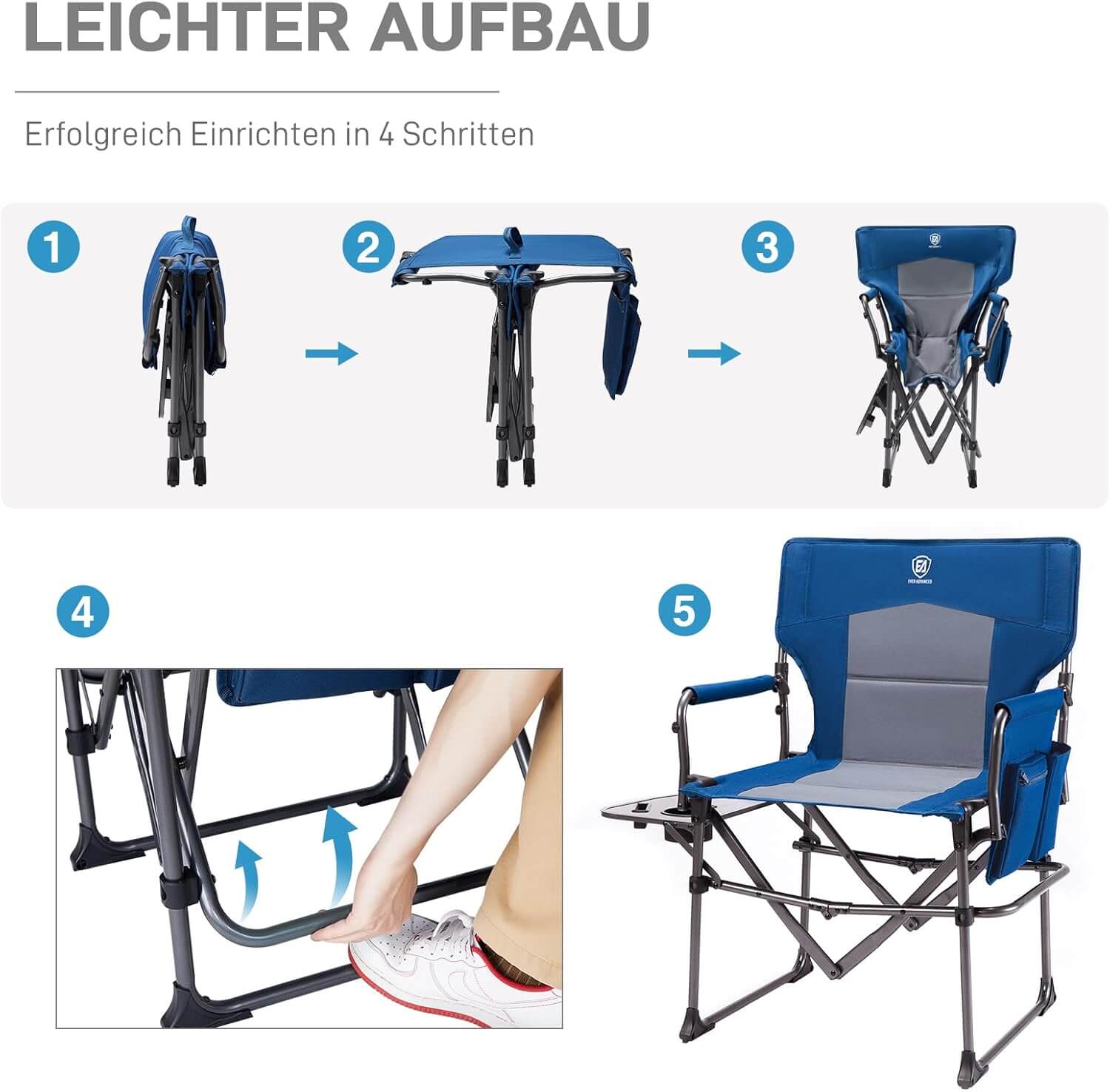 📖 Представяме Ви Сгъваем къмпинг стол с масичка Ever Advanced – до 180 кг, с поставка и джоб, удобен за къмпинг, риболов и пикник.