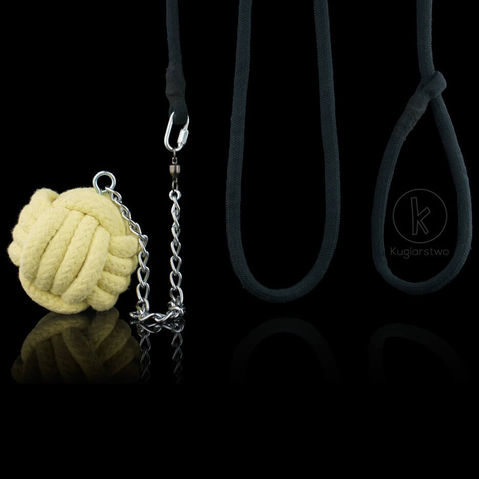 As rope darts create a large amount of force, we use the 2,5 mm twisted chain, triple rings and a super strong swivel. 35 cm of the twisted chain are followed by 10 mm thick cotton cord – this is not fireproof, therefore you should avoid contact with the flames. You can wet the cord, if you want to be on the safe side. The default handle it is the loop, alternatively you can choose a silicone ball handle. The Rope Dart is a rare and original fire prop for real fire ninjas!
