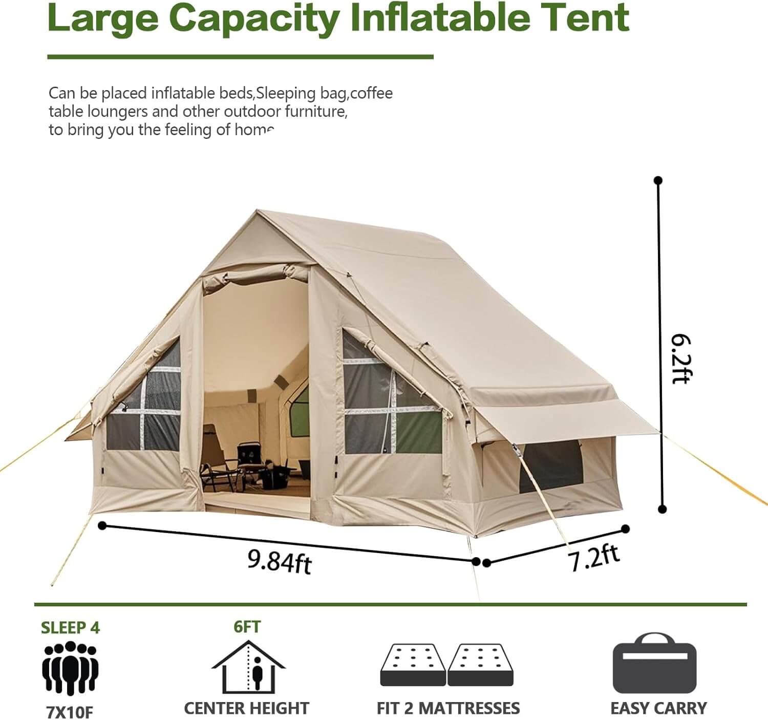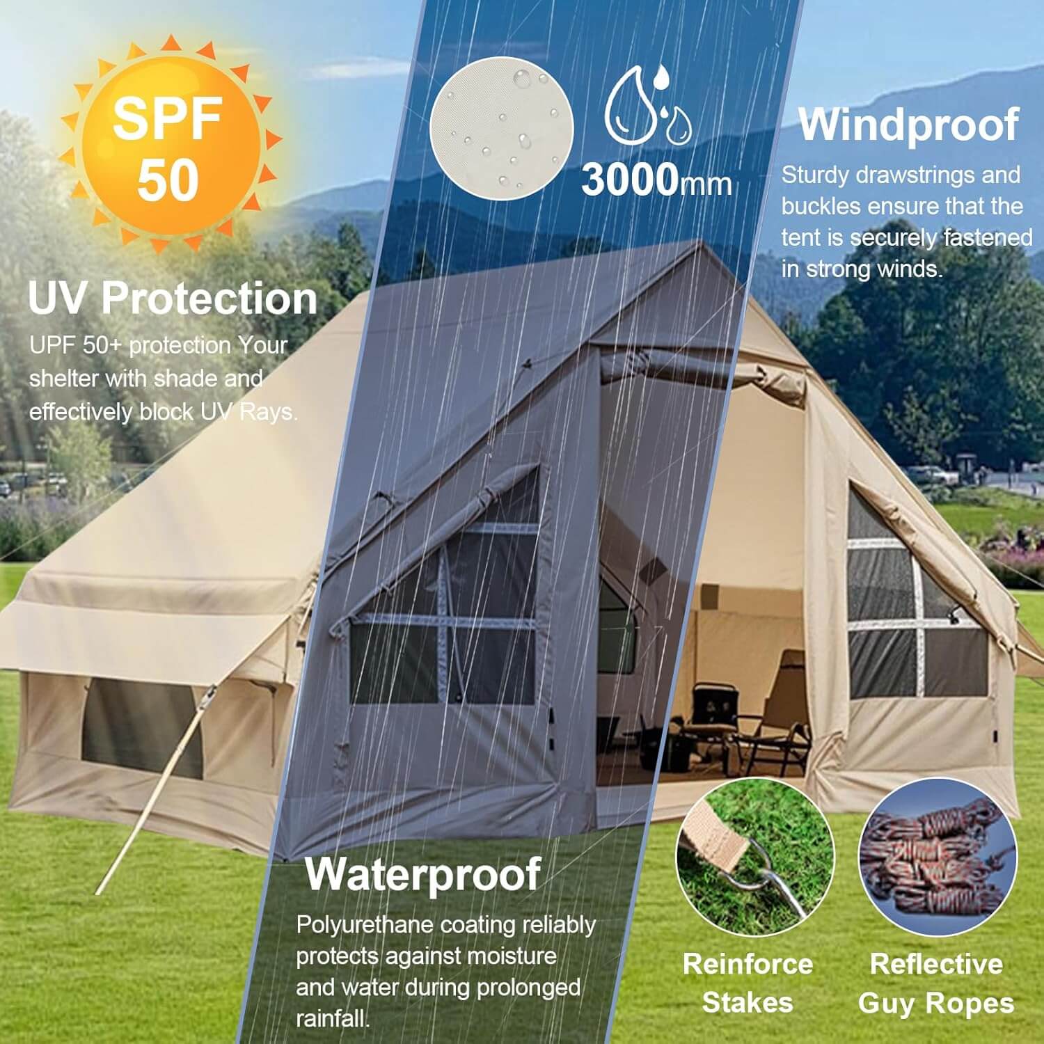 С UV защита и здрава конструкция, тази надуваема палатка е подходяща за използване през всички сезони – от летни приключения до по-хладни нощи сред природата.