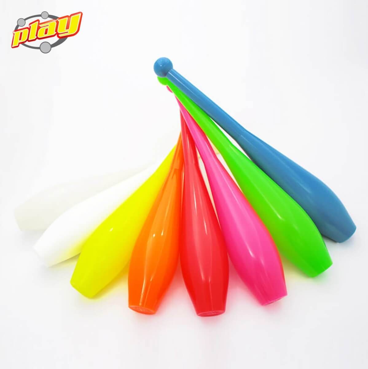 📖 These are one piece clubs from Play, Italy. These clubs differ from the Flare One Piece in that they are made with a heavier, softer plastic. This gives the club a more suitable weight for outdoor use, a softer catch and excellent durability. Very bright UV colours with a subtle seam. The knobs are rounded and suitable for those who like club swinging. Great for beginners and for advanced jugglers too. They come in a variety of bright colors.